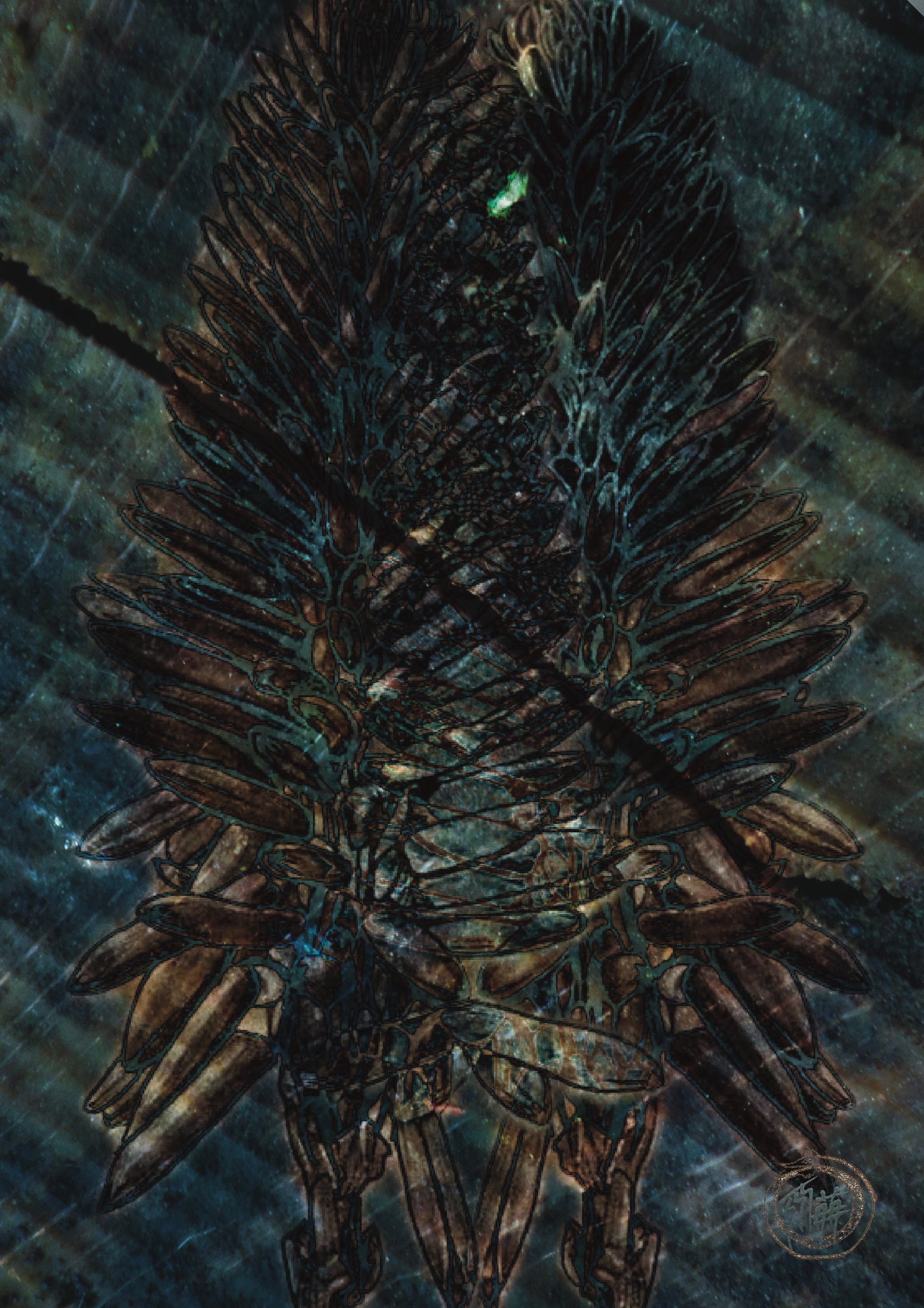 Rooted in resilience and renewal, the form reveals an aloe vera flower — a symbol of healing born from harshness. Its metallic petals twist through shadow and shimmer, poised between growth and decay. The piece captures the tension of concealment and revelation, where transformation hides in darkness and the unseen begins to take shape.